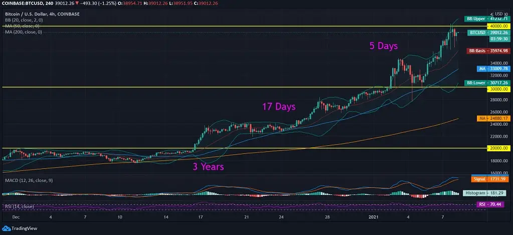 On the above Bitcoin price chart, it is clear that the higher resistances were broken quickly as compared to the previous ATH that Bitcoin hit at $20k, three years back in 2017. It approximately took three years from December 2017 to December 2020 for Bitcoin to retrieve back to $20k, 17 days to cross $30k in December 2020 itself and, only five days to cross $40k.