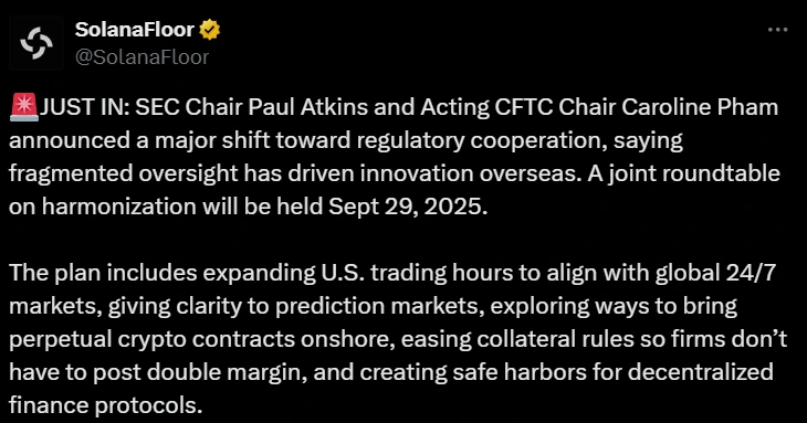- SEC and CFTC will conduct a joint roundtable to be held on Sept. 29, 2025